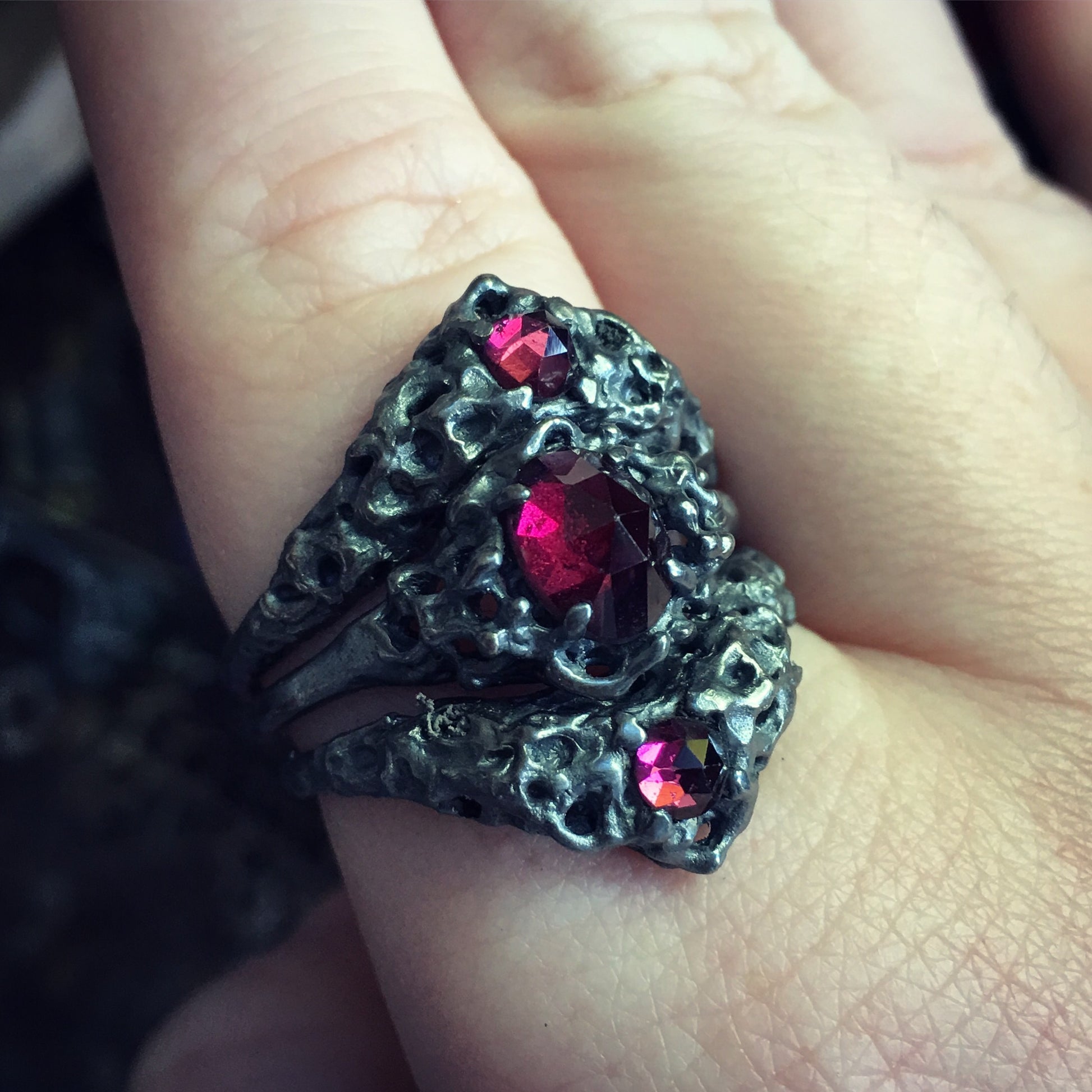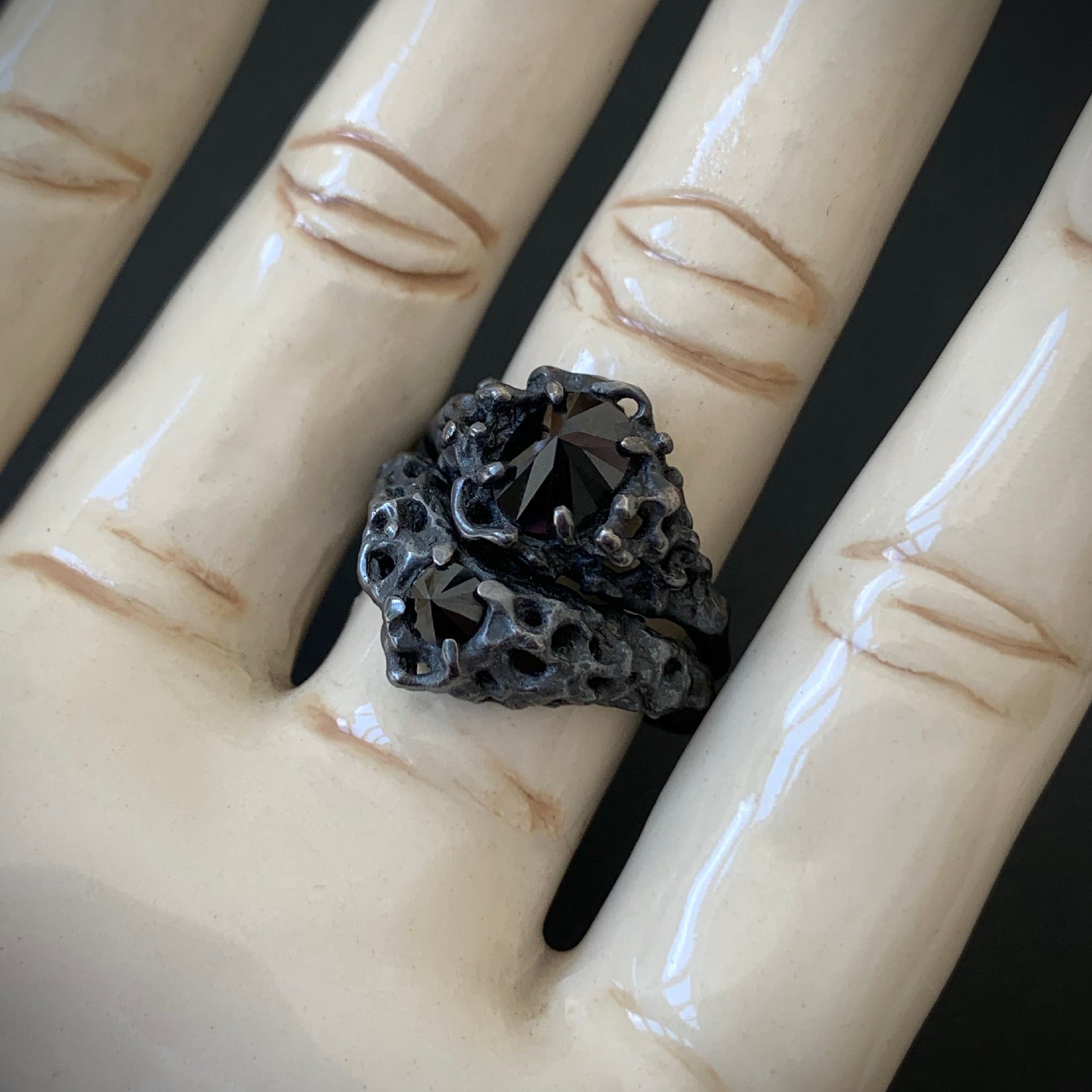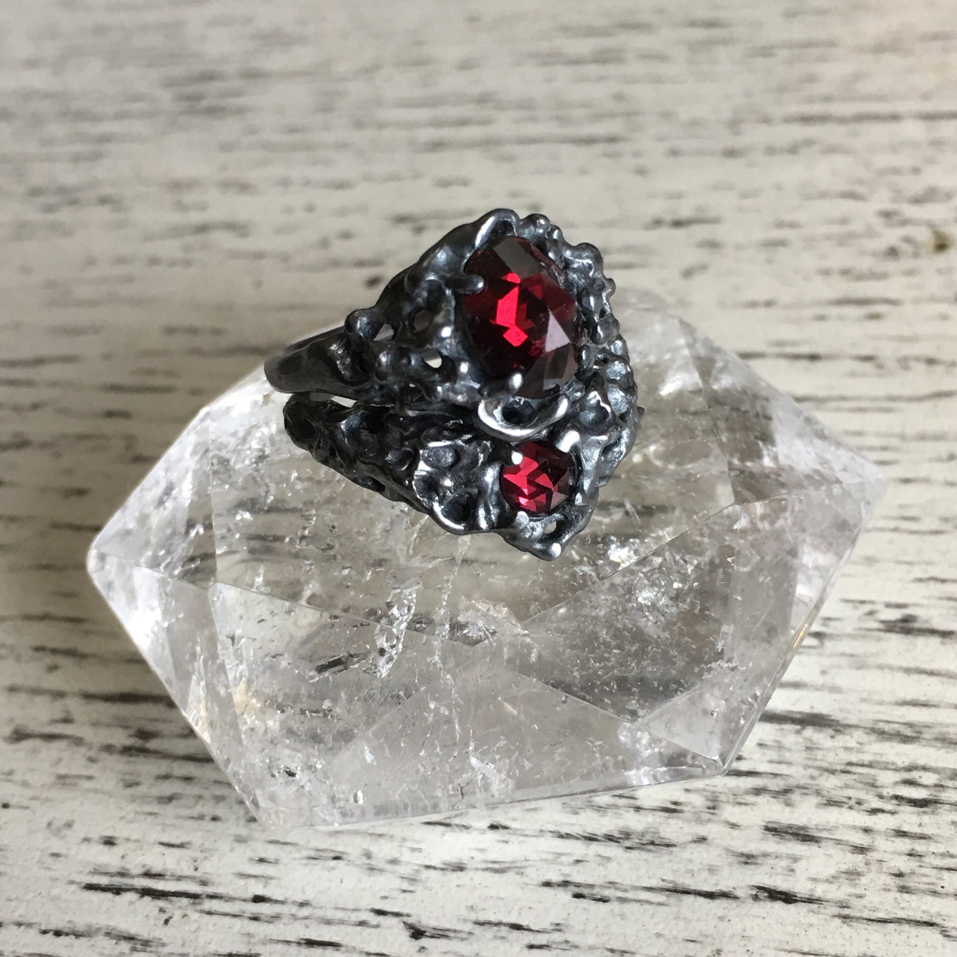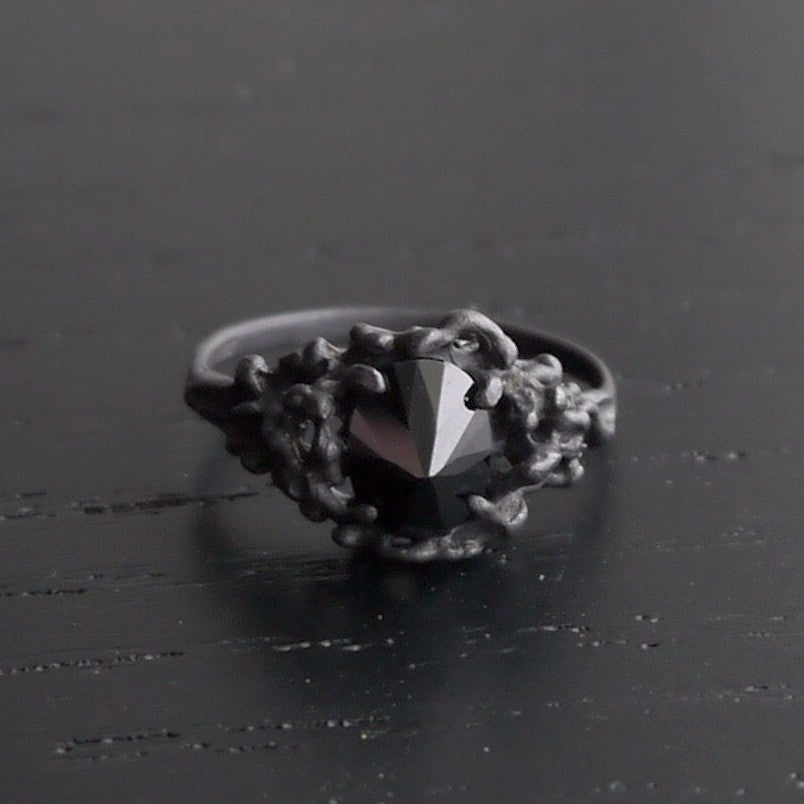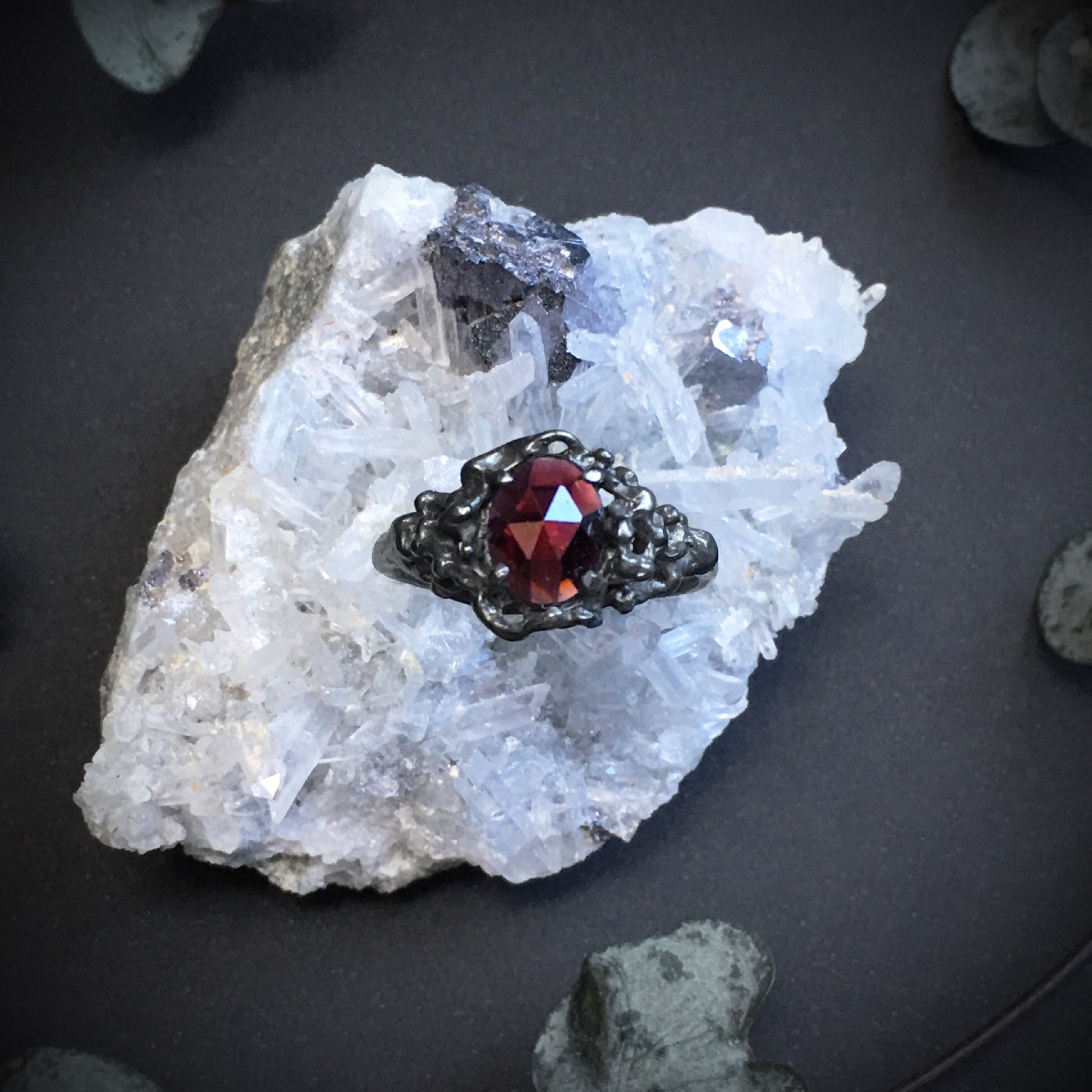 This delicately beautiful ring is made with a cast of a vintage ring setting which has been re-invented in dark gunmetal grey sterling silver. Set in the ring is either a beautiful, Inverted Black CZ, or rose cut garnet. The oxidisation will wear off over time, if you want to maintain it though i would suggest buying some Liver of sulphur. ( i can give you a link and instructions when you buy it, just leave me a message)