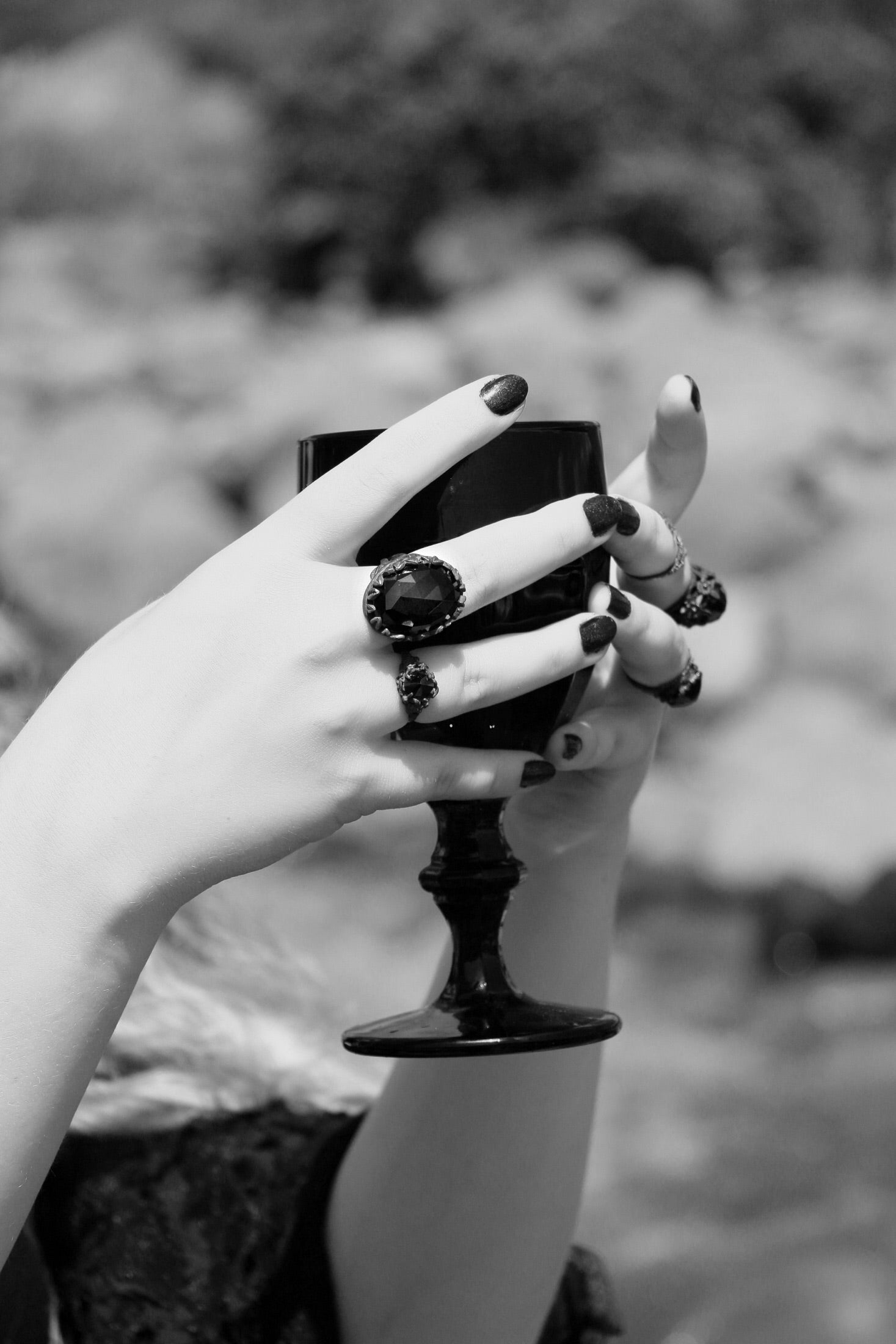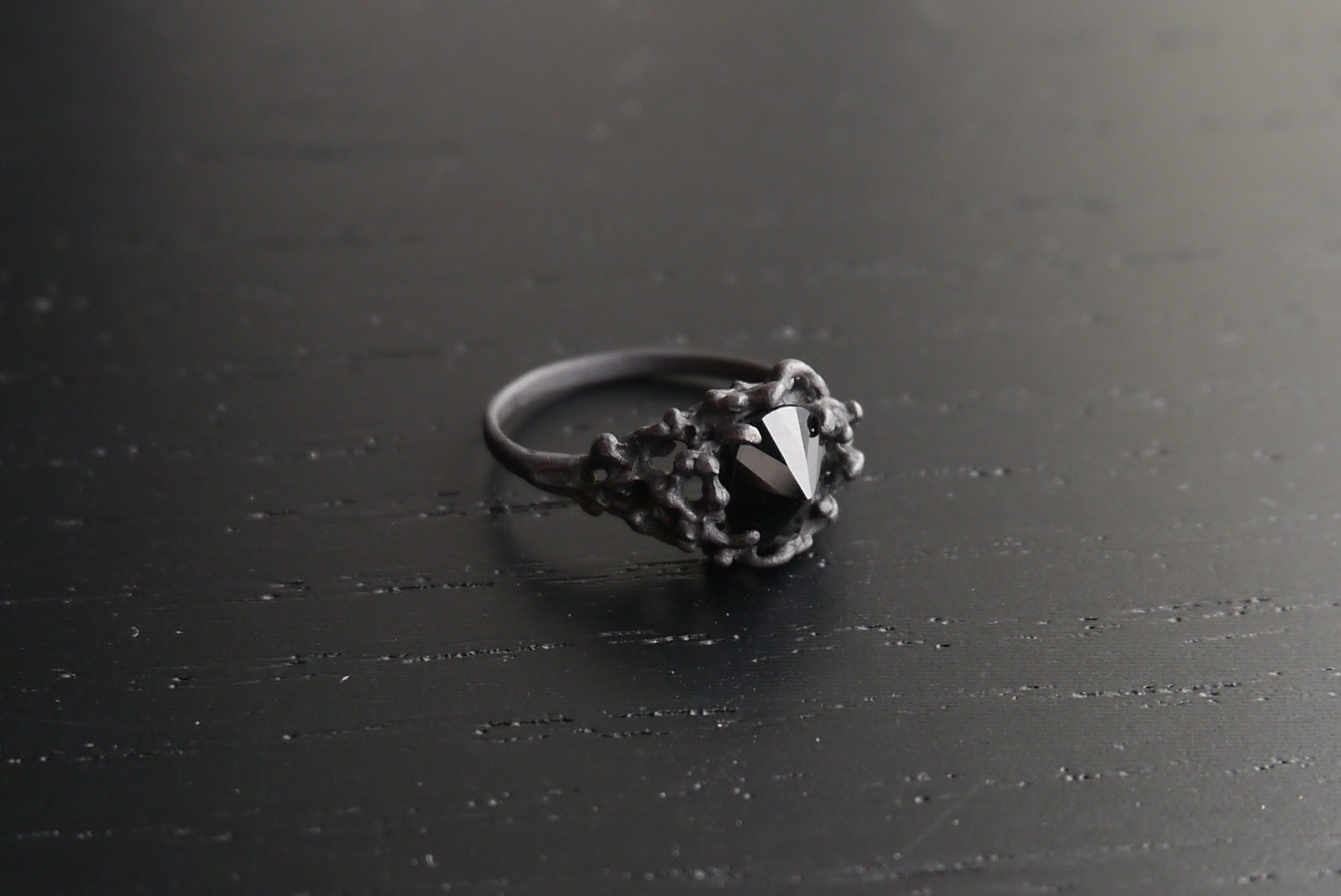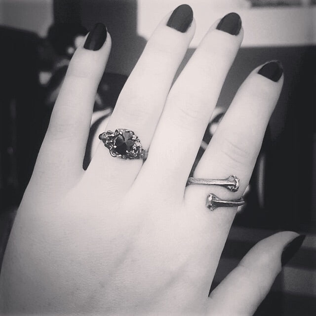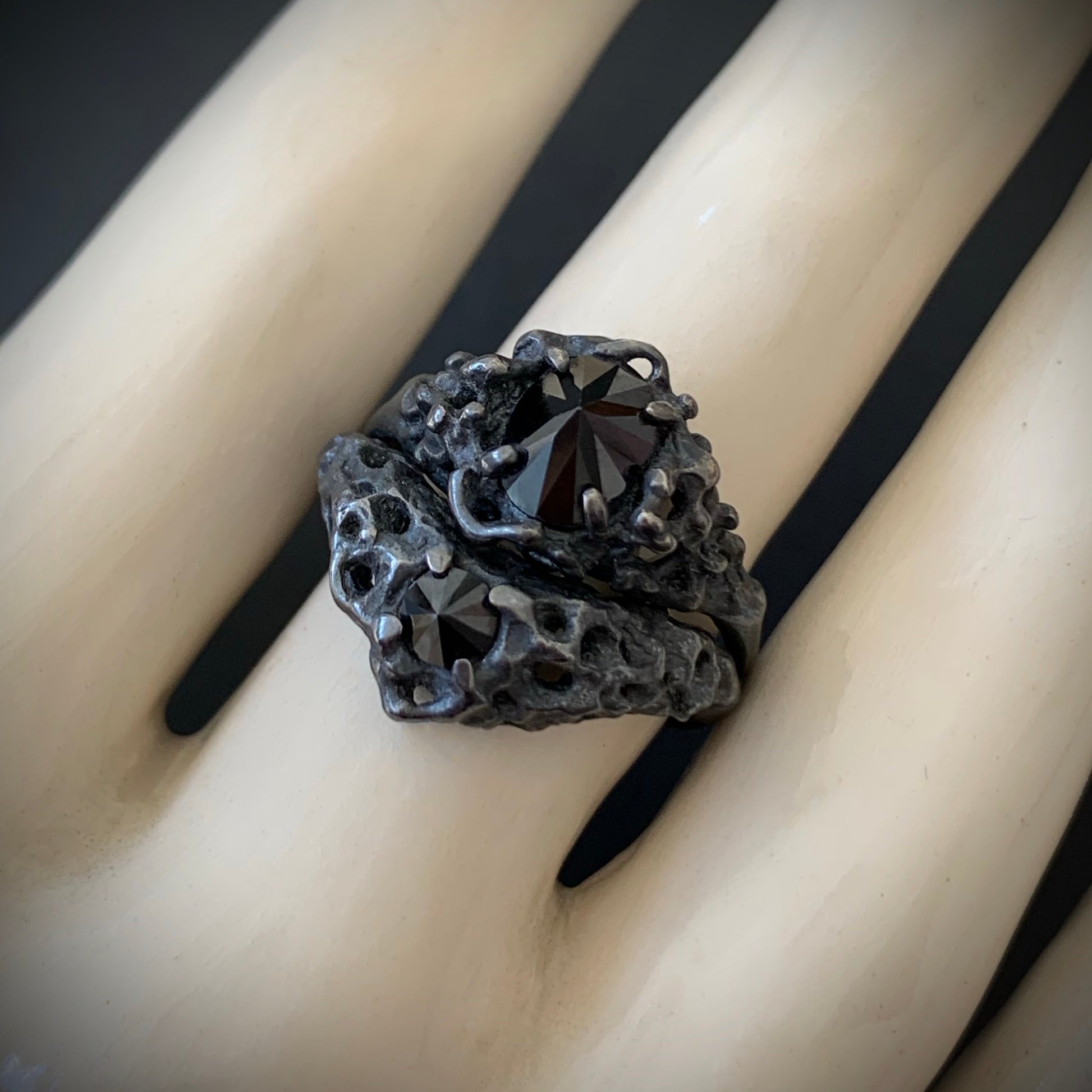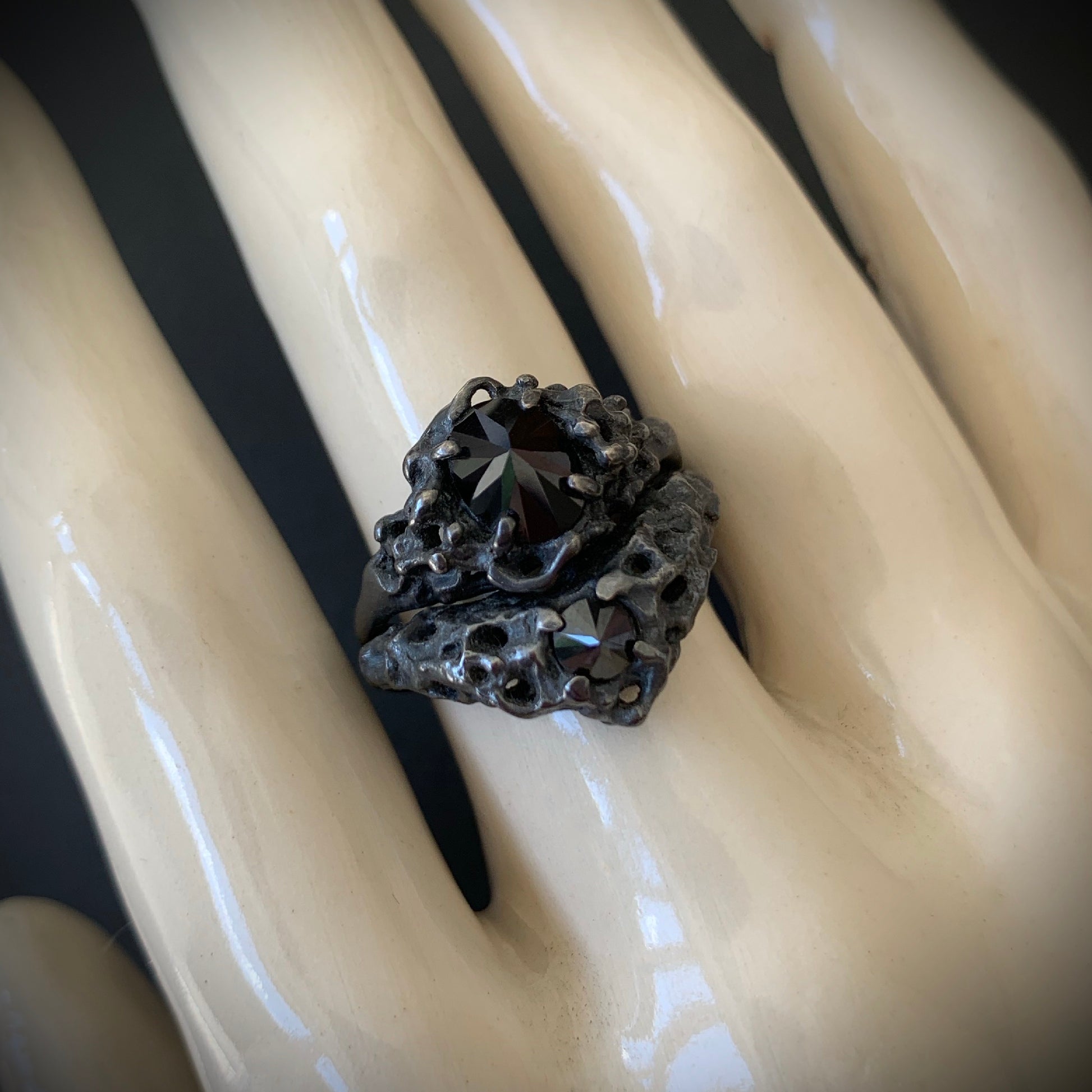 This delicately beautiful ring is made with a cast of a vintage ring setting which has been re-invented in dark gunmetal grey sterling silver. Set in the ring is either a beautiful, Inverted Black CZ, or rose cut garnet. The oxidisation will wear off over time, if you want to maintain it though i would suggest buying some Liver of sulphur. ( i can give you a link and instructions when you buy it, just leave me a message)