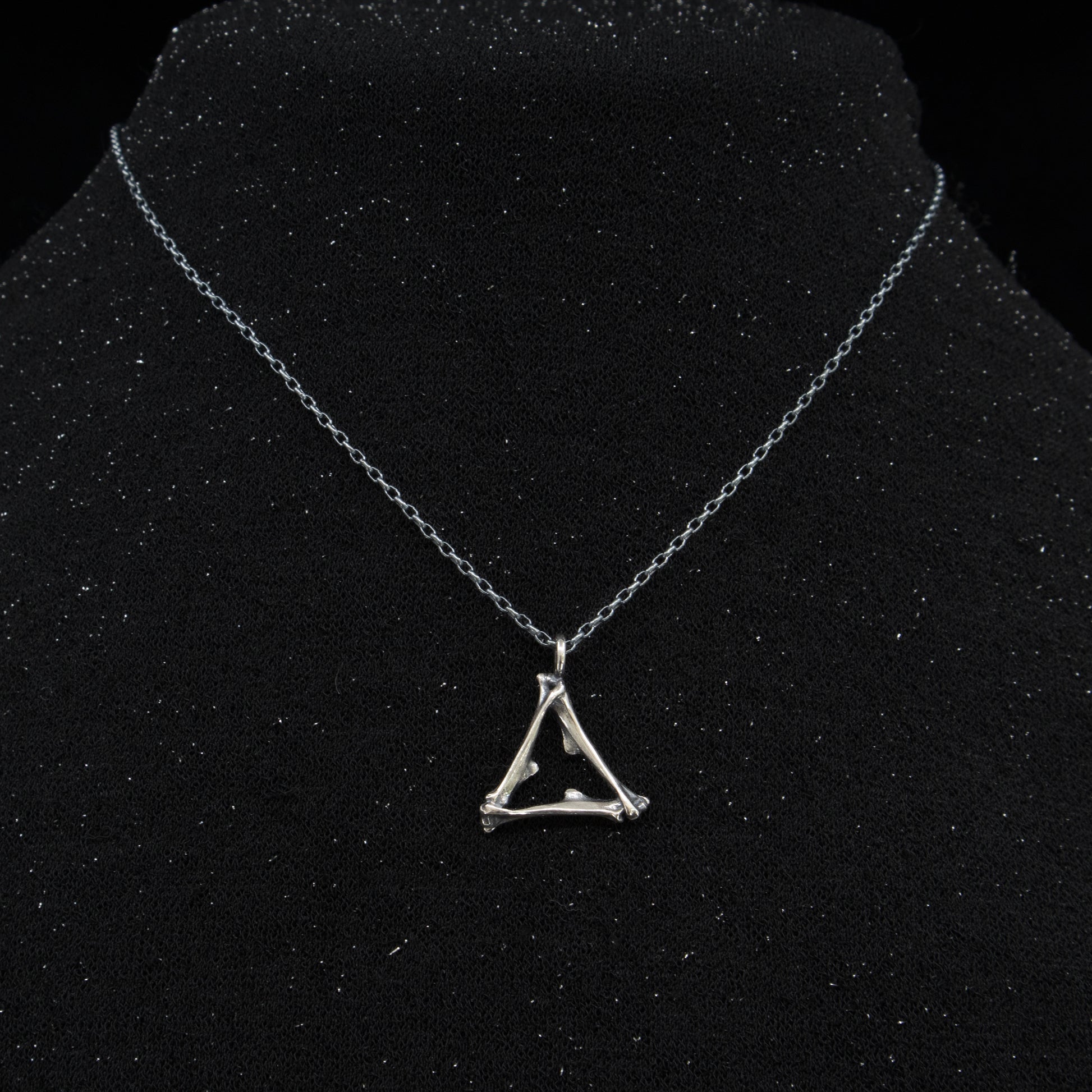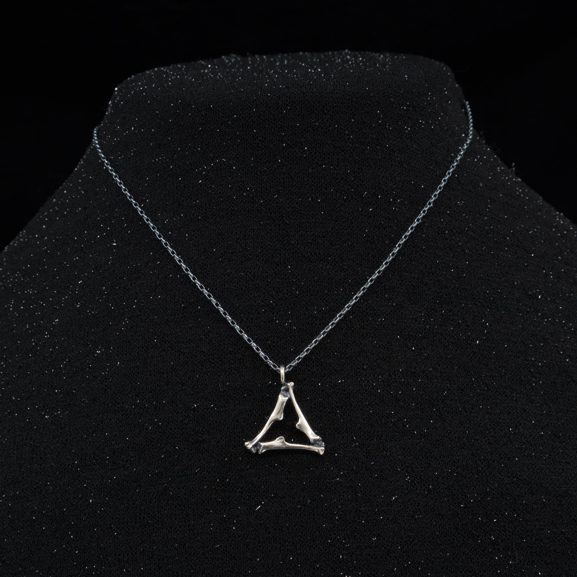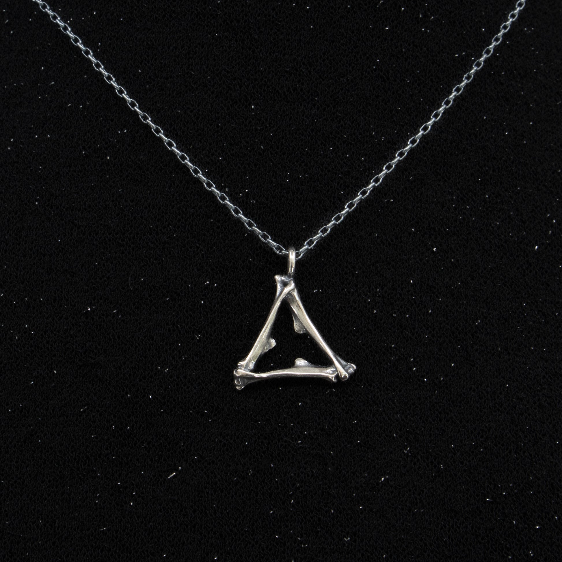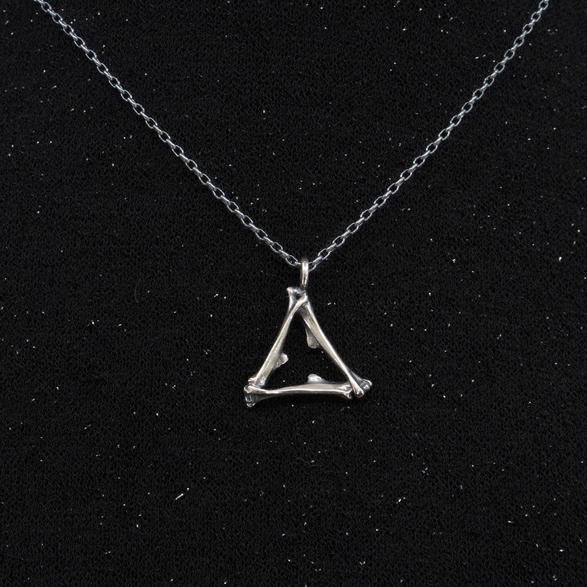 This wee pendant has mouse bones cast in sterling silver set in the alchemy shape of the symbol for fire.