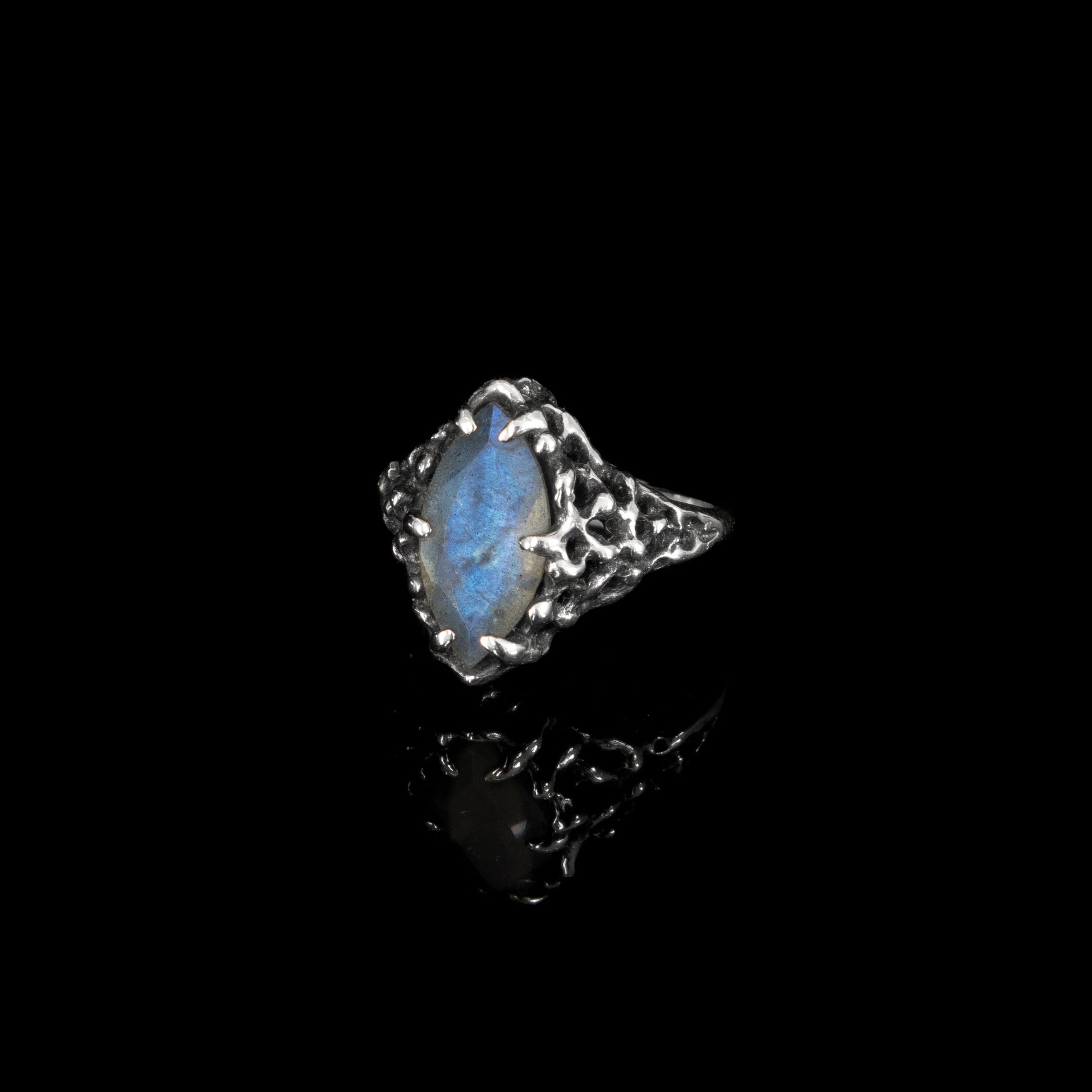 It features a beautiful faceted Marquise shape gemstone of your choice, with a setting reminiscent of ocean corals, or cooled lava.