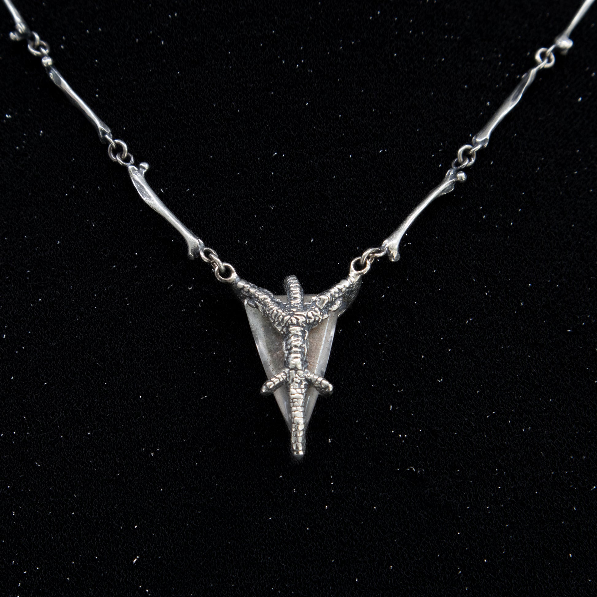 This Stunner features a beautiful triangle white Lodolite Quartz (or garden quartz) grasped in a unique silver setting of parrot talons in a unique shape . It hangs from a beautiful mouse bone chain. The bone chain contains 16 bones, and is 17 inches long including the centrepiece with an extra two inches of sturdy extender chain.