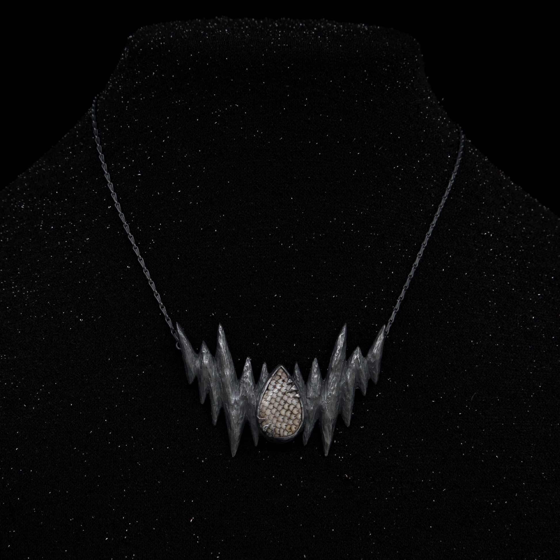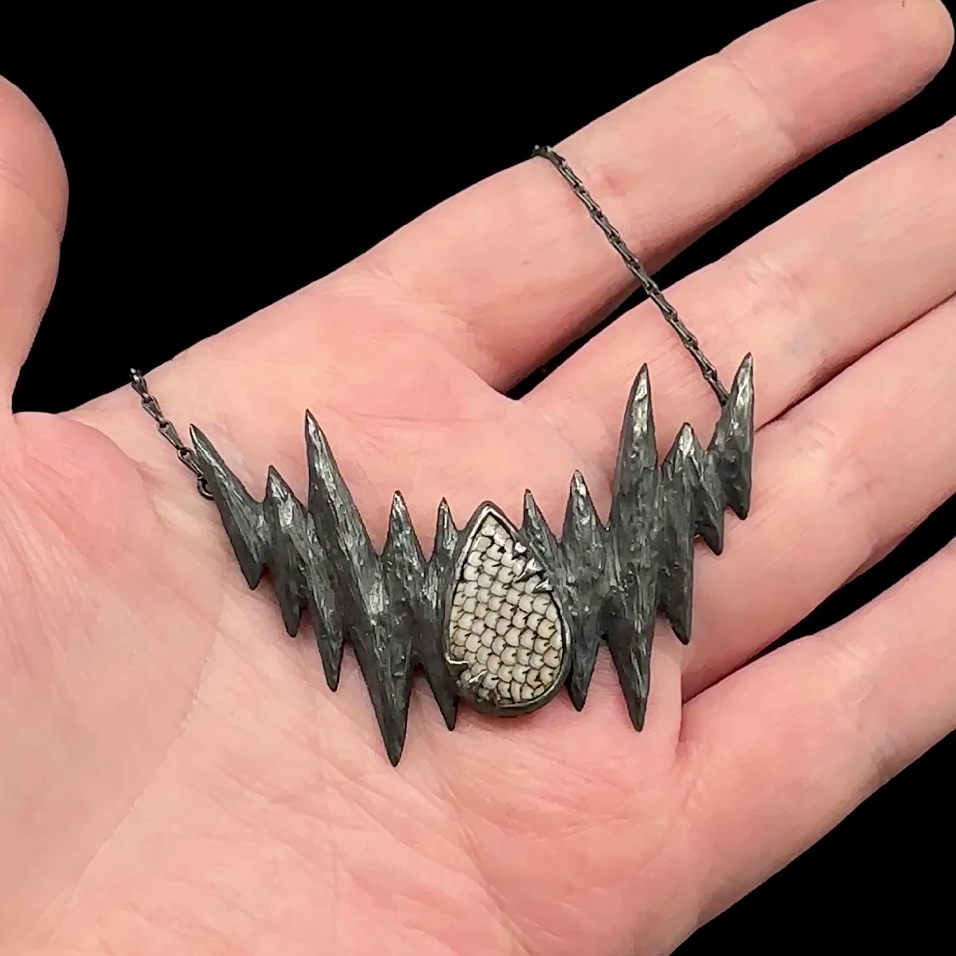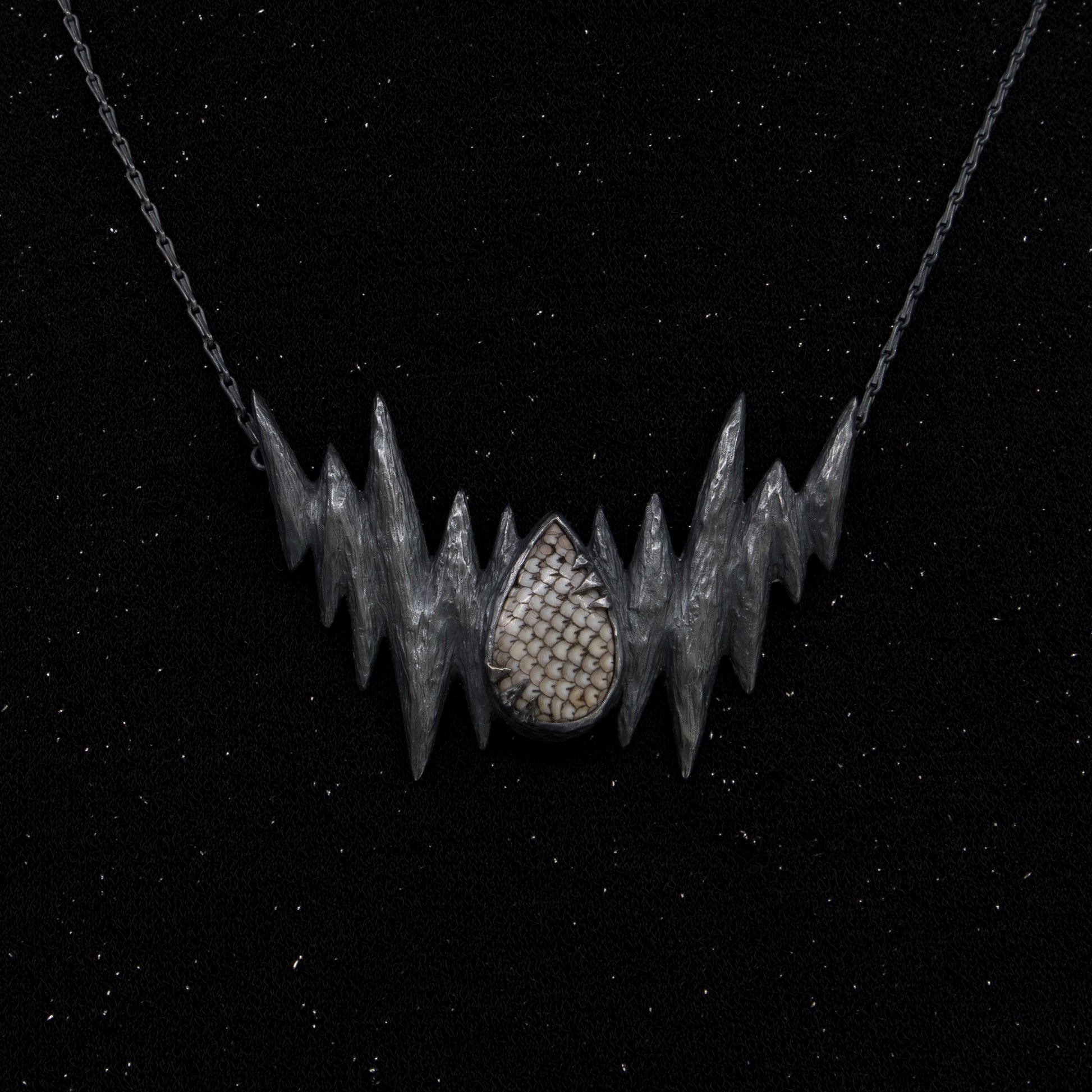 This It has a fearsome spiky hand carved design, inspired by all the renditions of Nosferatu and Dracula, showcasing an absolutely stunning Snakeskin pattern fossilised wrasse. the necklace is made of Sterling silver and has an oxidised finish