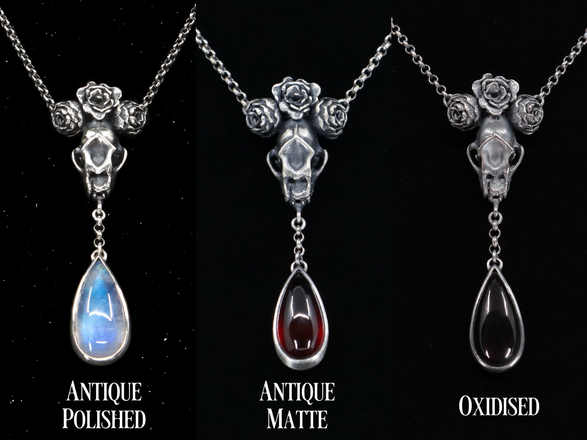 This Elegant and dark necklace features A silver casting of a bat skull wearing a crown of flowers (hand carved in wax and cast immortal in sterling silver.) Hanging below is a beautiful blood red Hessonite Garnet (now Also available in rainbow moonstone, Labradorite and Onyx)