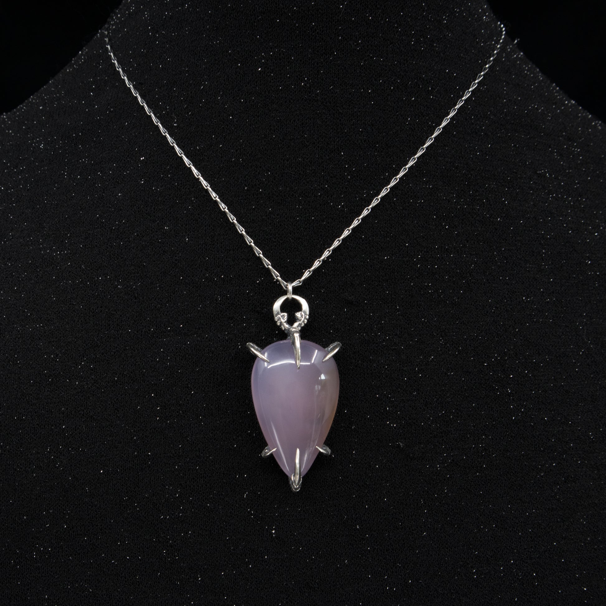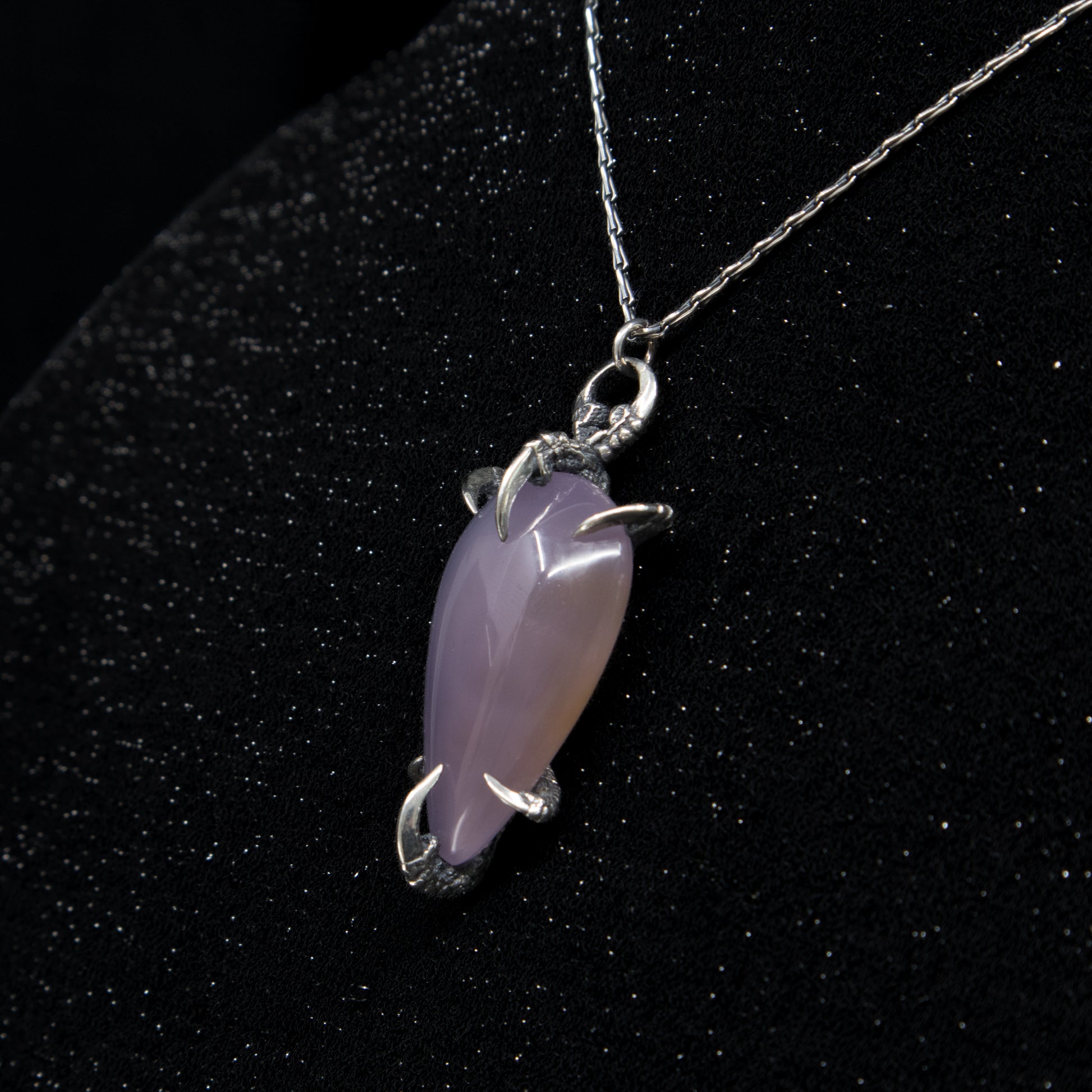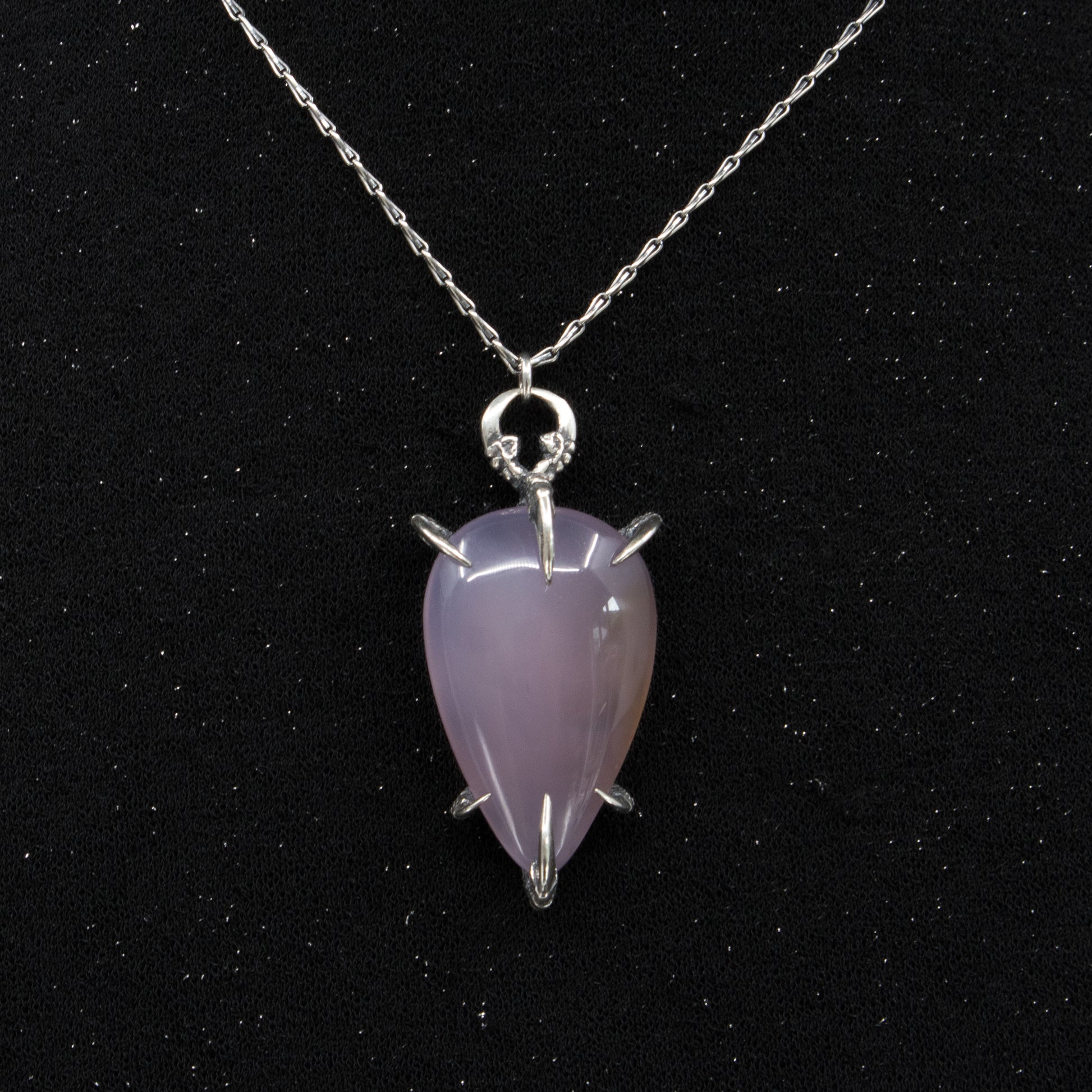 This delectable Purple Chalcedony Set in a hand carved talon Setting (mixing wax carving techniques and moulds of real parrot claws). The purple chalcedony looks like a delicious piece of candy, and hangs from a 24 inch barleycorn chain. This pendant really has a protective powerful feeling to it.