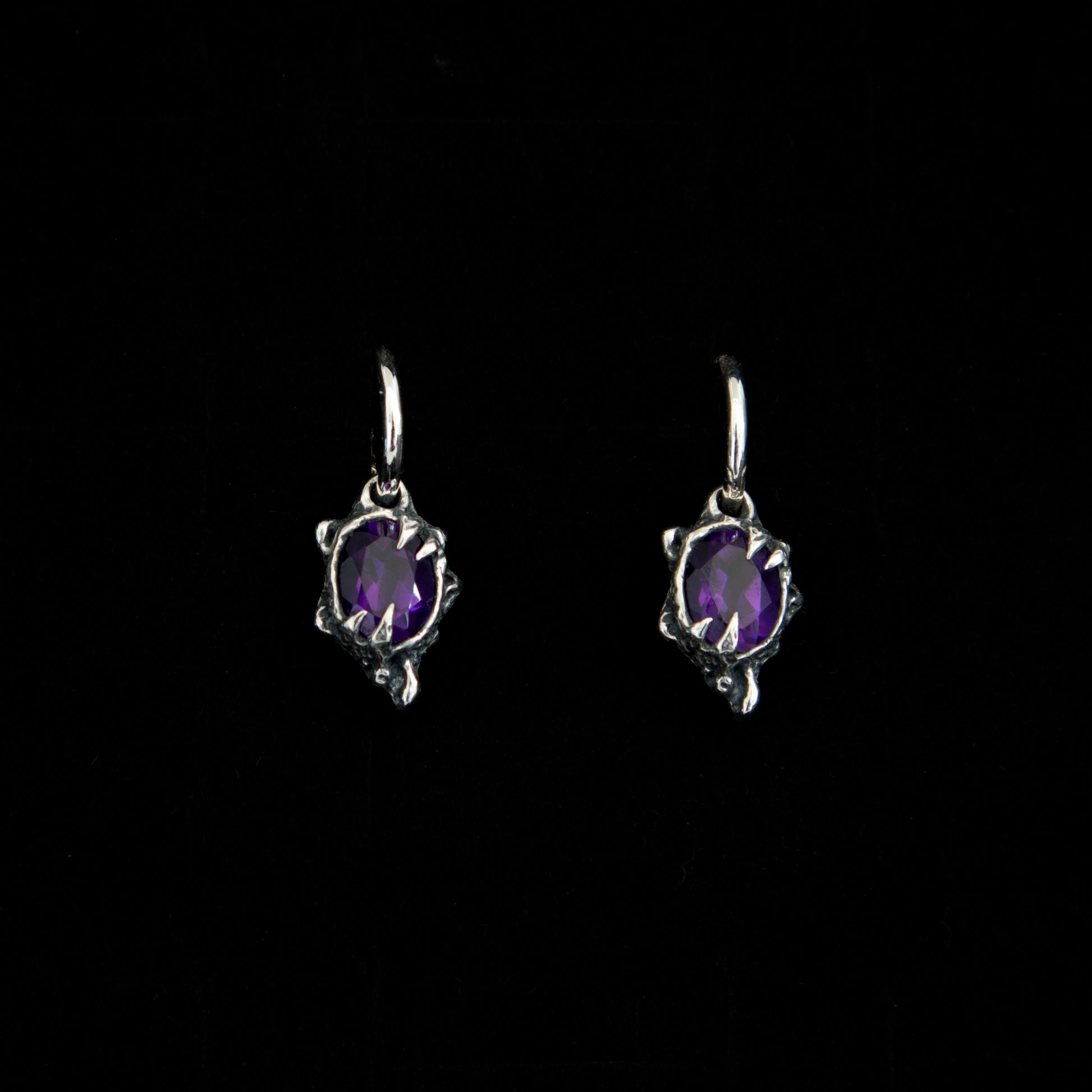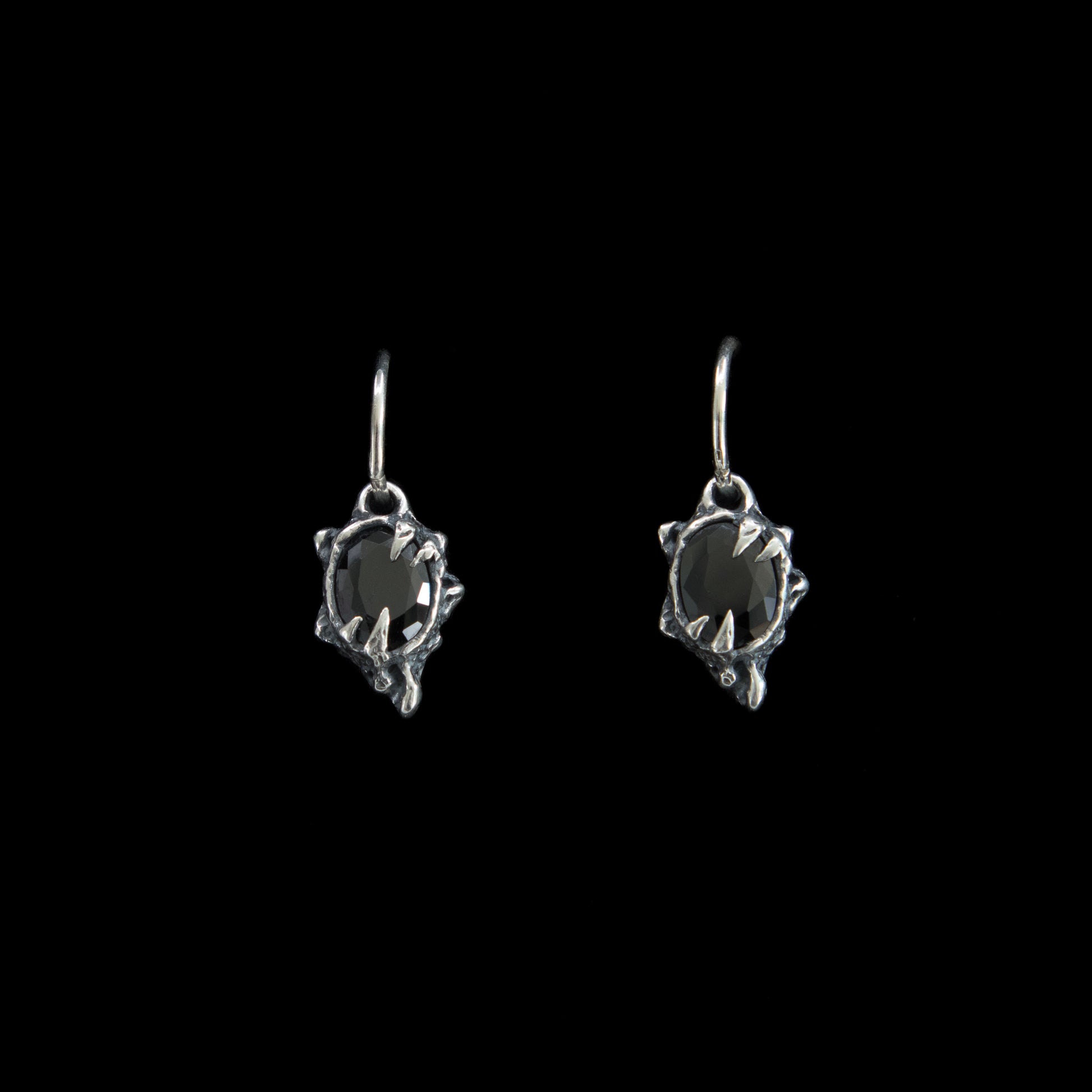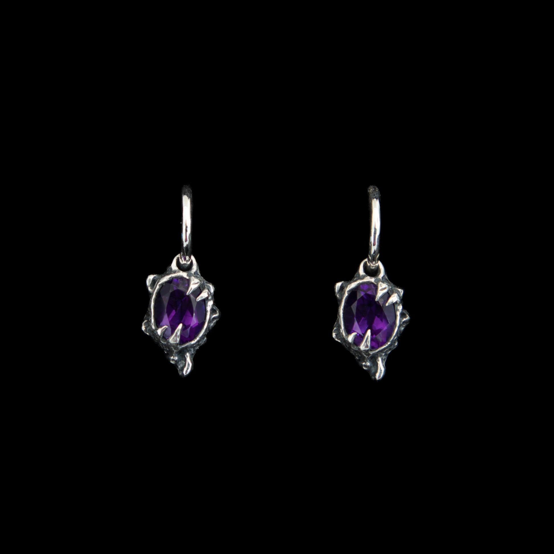 Hanging from 10mm Huggie Hoop earrings hang two delicate but fierce hand carved gloopy drops with claws grasping a 6x8mm gemstone of your choice. It can come in either an antique polished, Antique matte or fully oxidised finish. They are comfy and delicate enough to wear 24/7.