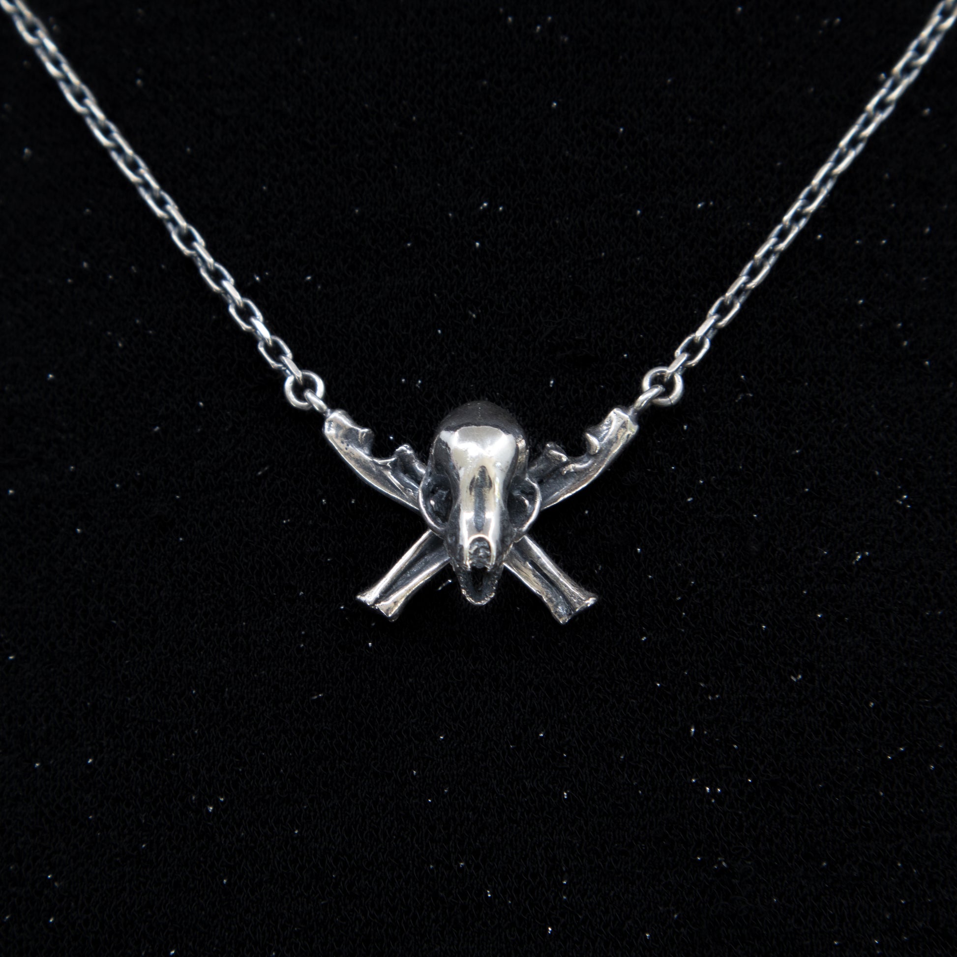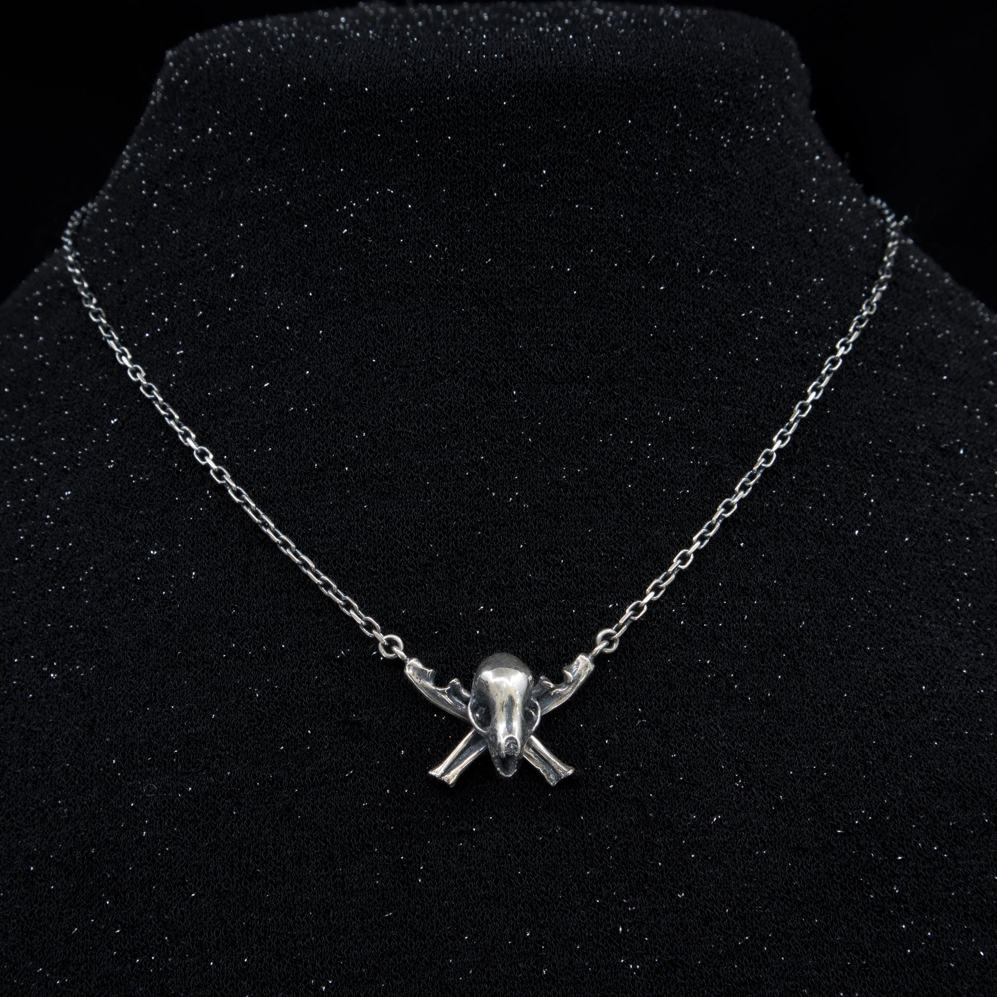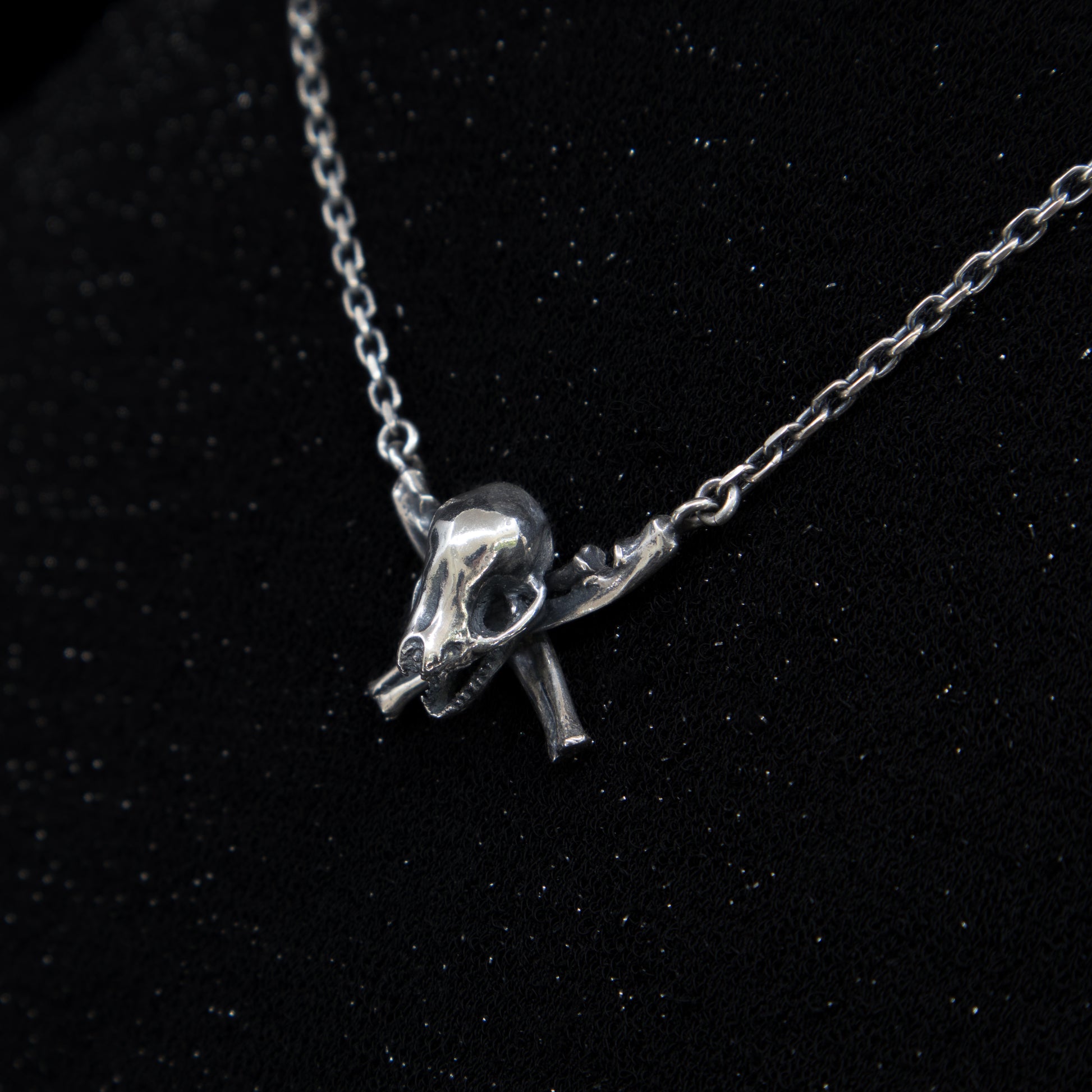 This necklace features a small bat skull sitting atop of rat crossbones, hanging from a paper clip chain.